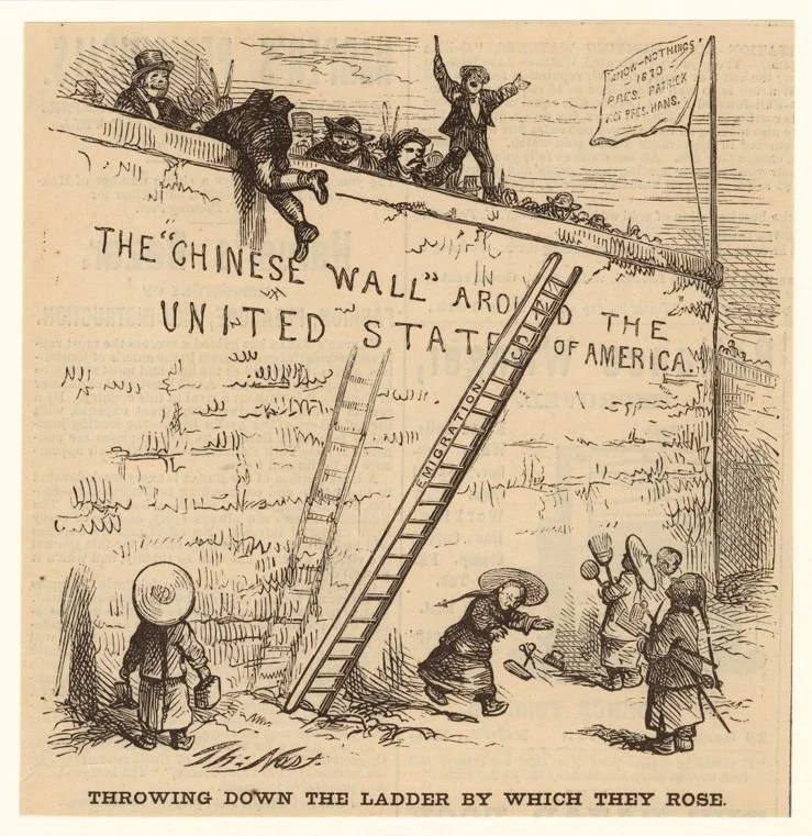 Another Catholic immigrant of this moment, Thomas Nast, who definitely did attend New York City schools in the 1850s, would go on to become the greatest political cartoonist of his age. Nast was born in Bavaria in 1840 and came to the United States as part of the same Irish and German waves of immigration that the Know-Nothing movement was created to oppose. Nast’s career was well advanced by 1870, when he produced a cartoon about how American attitudes to immigration were evolving. Once the Germans and Irish Catholics assimilated, many of them in their turn struck a hardline anti-immigration stance toward new Chinese arrivals. Recognizing this irony led Nast to one of his most famous and prophetic satirical efforts: “Throwing Down the Ladder by Which They Rose.” Atop the newly walled border around the United States, under an updated Know-Nothing flag, stand assimilated Irish and German Catholic immigrants. They are led by President Patrick and Vice President Hans, presumably Irish and German leaders of the new Know-Nothings, a reincarnation of the very movement that had so relentlessly persecuted them, or their parents, a quarter of a century earlier.